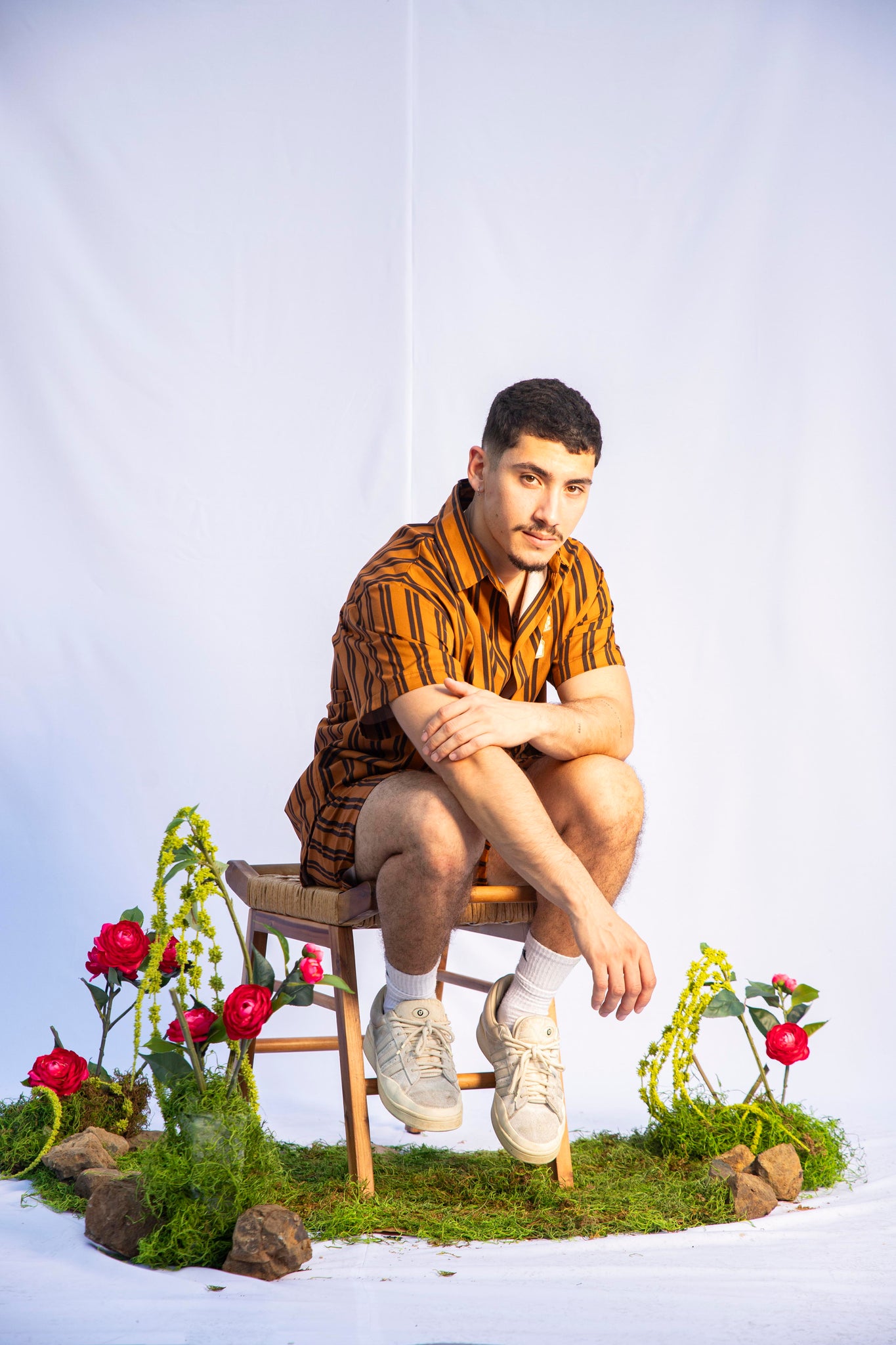 Unique orange with brown stripes with embroidered flower on shirt, set with short with elastic band on waist and pockets on the sides, fits 29’ 34’ waist.