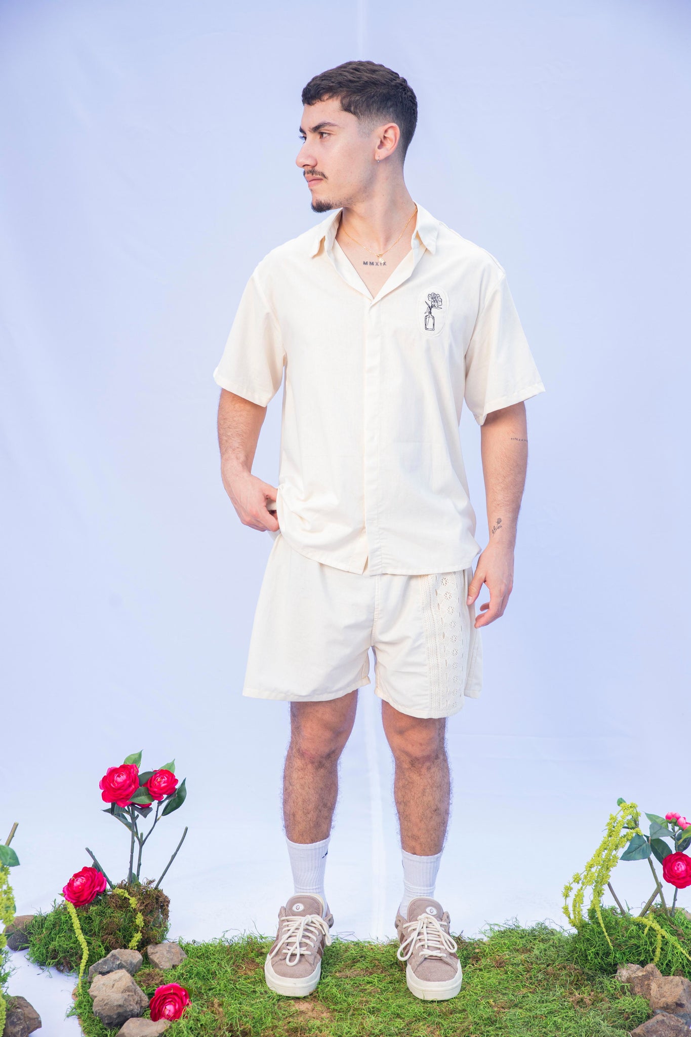 Linen dusty white flower embroidered patch on shirt, soft material with invisible buttons.