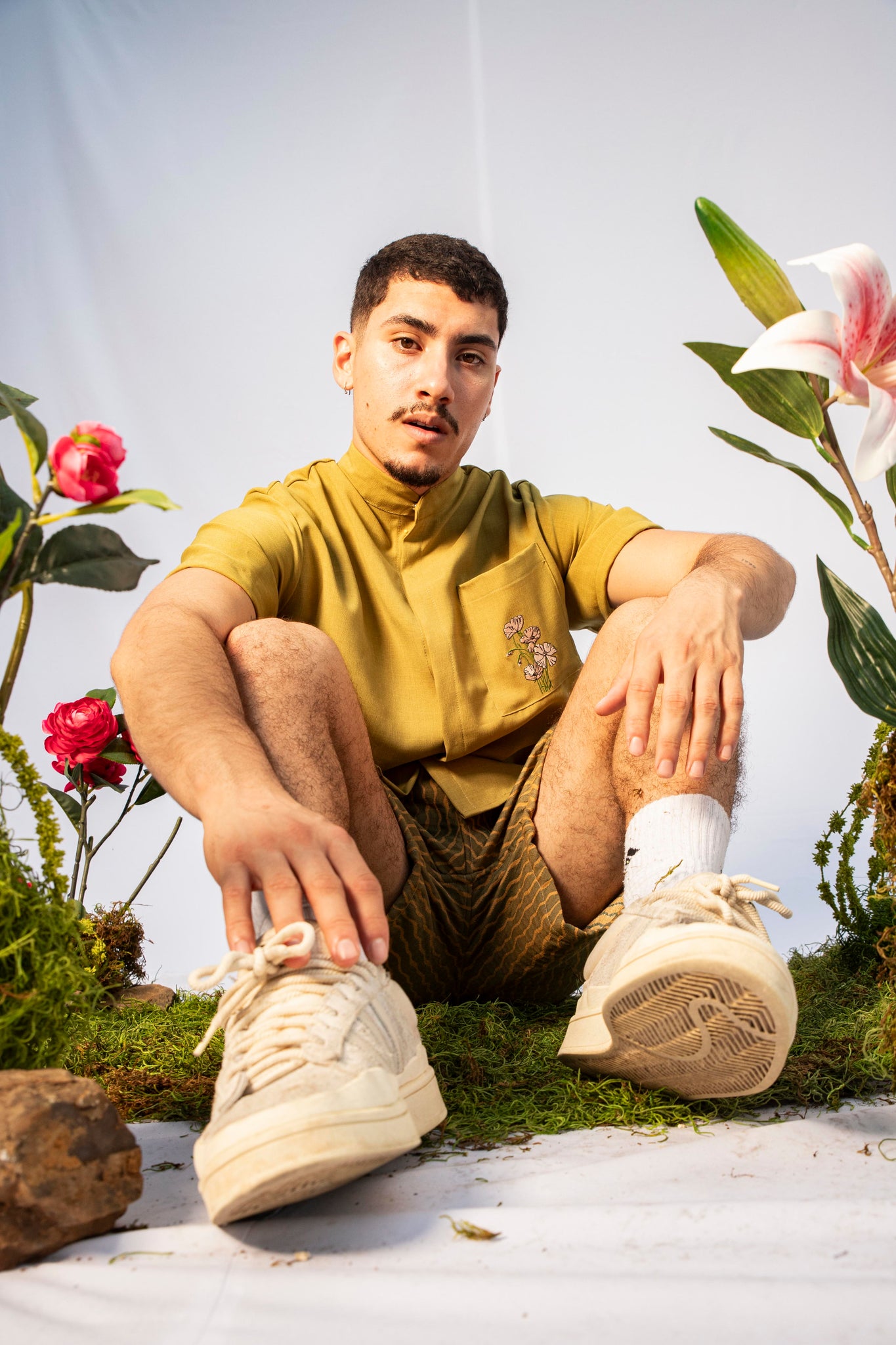 Two tone green brocade short with unique pocket on side. Elastic waist 29’ -34’