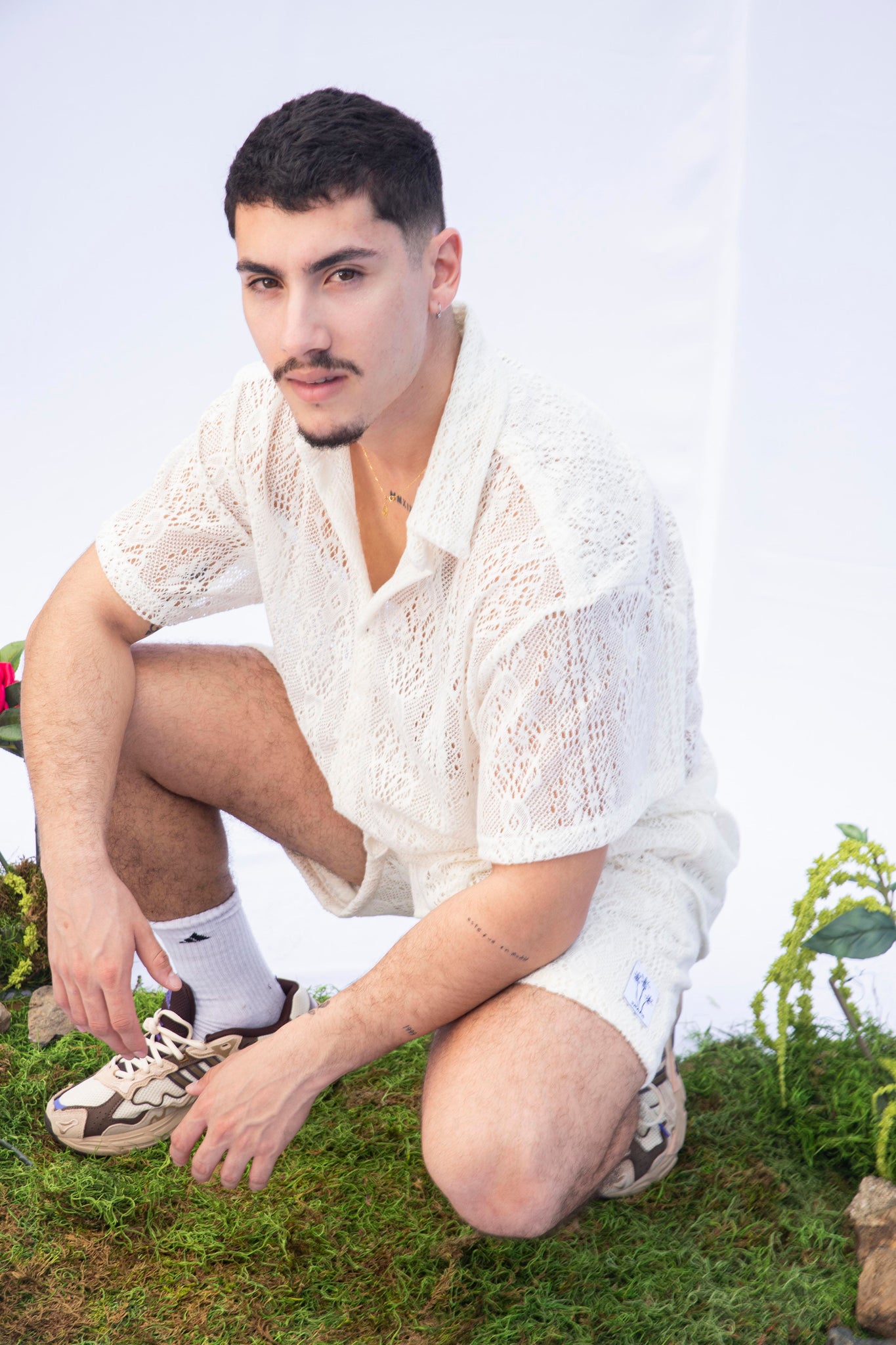 Stretchy off white lace with elastic band on waist and pockets on the side. Fits 29’-34’ waist